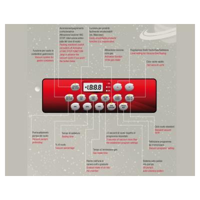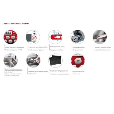 Γρήγορο, εύκολο στη χρήση, ανοξείδωτο ατσάλι, στιβαρή κατασκευή. Διάφανο καπάκι για τον έλεγχο της συσκευασίας. Στεγανοποίηση στο 99%, με 10 προγράμματα και πρόγραμμα για την συσκευασία υγρών. Θάλαμος κατασκευασμένος με στρογγυλεμένες γωνίες για εύκολο καθαρισμό. Διπλός αισθητήρας για στεγανοποίηση υγρών και αναρρόφηση vacuum. Mια μπάρα μεγάλου μήκους και πάχος 5mm. Επιλογές αντλίας θέρμανσης και αυτοκαθαριζόμενης αντλίας για να διατηρούνται οι αντλίες καθαρές και να λειτουργεί το μηχάνημα χωρίς βλάβες. Λειτουργία STEP VAC για τη συσκευασία υγρών. Λειτουργία SOFT VAC για ήπια στεγανοποίηση ώστε να μην καταστρέφονται τα προϊόντα. Πρόγραμμα για μαρινάδα κρέατος. Ιδανικό για καπνιστά λουκάνικα, κρέας, ψάρια κ.α. Απαραίτητο για τα ξενοδοχεία, τα εστιατόρια και κάθε επαγγελματική κουζίνα. Ιδανικό για συσκευασία κρέατος, ελιών, αλλαντικών, τυριών κλπ.