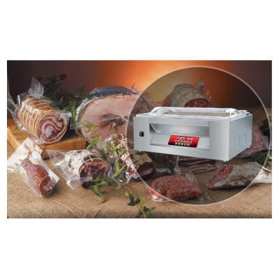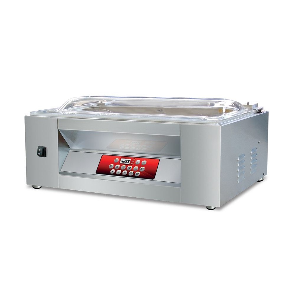 Γρήγορο, εύκολο στη χρήση, ανοξείδωτο ατσάλι, στιβαρή κατασκευή. Διάφανο καπάκι για τον έλεγχο της συσκευασίας. Στεγανοποίηση στο 99%, με 10 προγράμματα και πρόγραμμα για την συσκευασία υγρών. Θάλαμος κατασκευασμένος με στρογγυλεμένες γωνίες για εύκολο καθαρισμό. Διπλός αισθητήρας για στεγανοποίηση υγρών και αναρρόφηση vacuum. Mια μπάρα μεγάλου μήκους και πάχος 5mm. Επιλογές αντλίας θέρμανσης και αυτοκαθαριζόμενης αντλίας για να διατηρούνται οι αντλίες καθαρές και να λειτουργεί το μηχάνημα χωρίς βλάβες. Λειτουργία STEP VAC για τη συσκευασία υγρών. Λειτουργία SOFT VAC για ήπια στεγανοποίηση ώστε να μην καταστρέφονται τα προϊόντα. Πρόγραμμα για μαρινάδα κρέατος. Ιδανικό για καπνιστά λουκάνικα, κρέας, ψάρια κ.α. Απαραίτητο για τα ξενοδοχεία, τα εστιατόρια και κάθε επαγγελματική κουζίνα. Ιδανικό για συσκευασία κρέατος, ελιών, αλλαντικών, τυριών κλπ.
