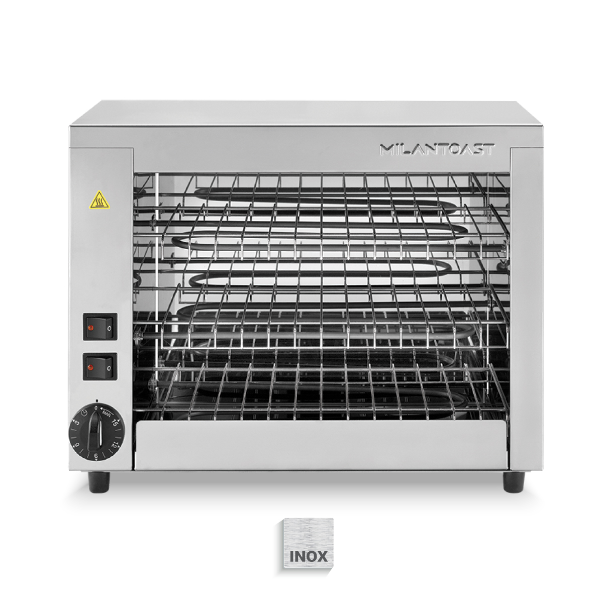 Description:Tοστιέρα-φρυγανιέρα 9 θέσεων , Milantoast Ιταλίας.Technical_data:Διαστάσεις 430x230x350(h)mm Καθαρό άνοιγμα 6,5cm Χωρητικότητα 9 φέτες Ισχύς 2,92 kW | 230V / 50-60Hz Σχάρες 3 Λαβίδες 9 Χρονοδιακόπτης 15 min Βάρος 7 Kg Κατασκευή Inox Αντίσταση Inox Συρτάρι για τα ψίχουλα