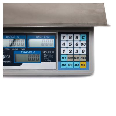 Τριών ενδείξεων φωτιζόμενη οθόνη χειριστή και πελάτου. Με ένδειξη βάρους, τιμή μονάδος, συνολική τιμή, τελείωμα μπαταρίας. Ο ζυγός χωρίς ιστό προσφέρεται και με τάσι λαικής 250x360mm. Τροφοδοσία μπαταρίας DC 6V-10Ax&xAC power cor. Διάρκεια μπαταρίας 1.000 ώρες με μία φόρτιση (2 έως 3 μηνες). Τάσι κανονικό. Πληκτρολόγιο με 5 ορατές μνήμες. Σύνδεση με ταμειακές μηχανές. Ιδανική λύση και για κρεοπωλεία, ζαχαροπλαστεία, ιχθυοπωλεία, οπωροπωλεία, καταστήματα αλλαντικών και ξηρών καρπών.ΥΠ.ΑΝΑΠΤΥΞΗΣ Φ2-591/2014.